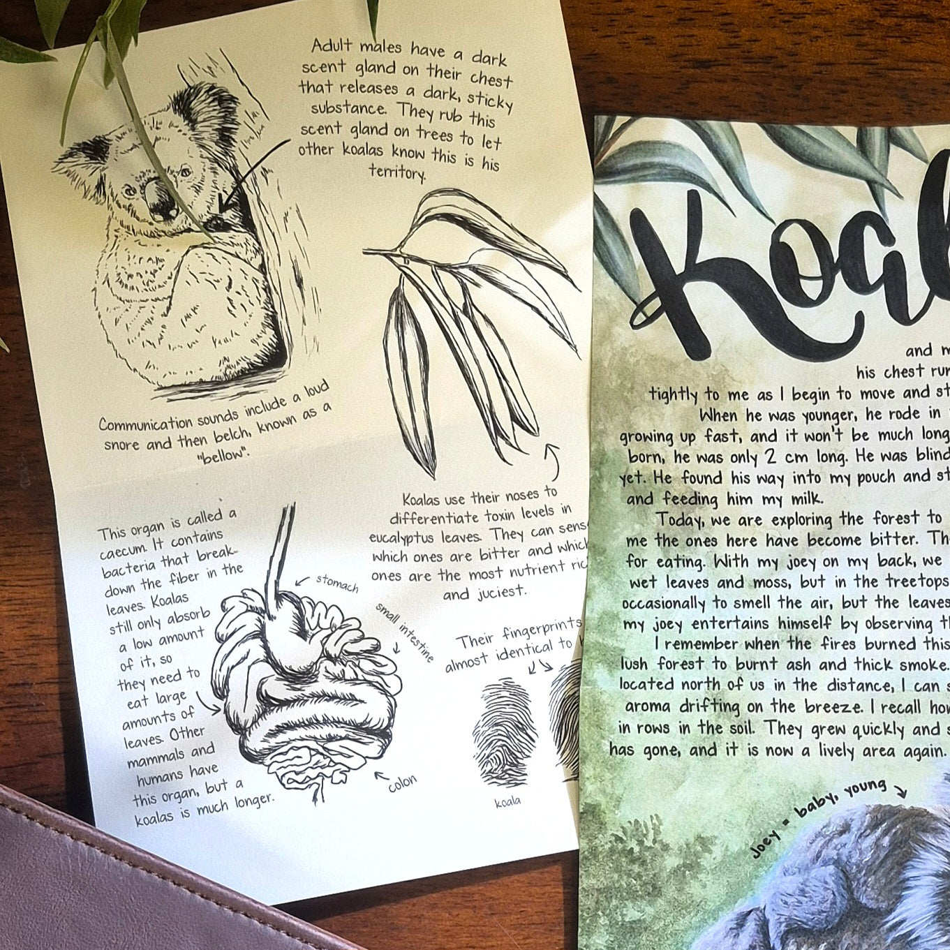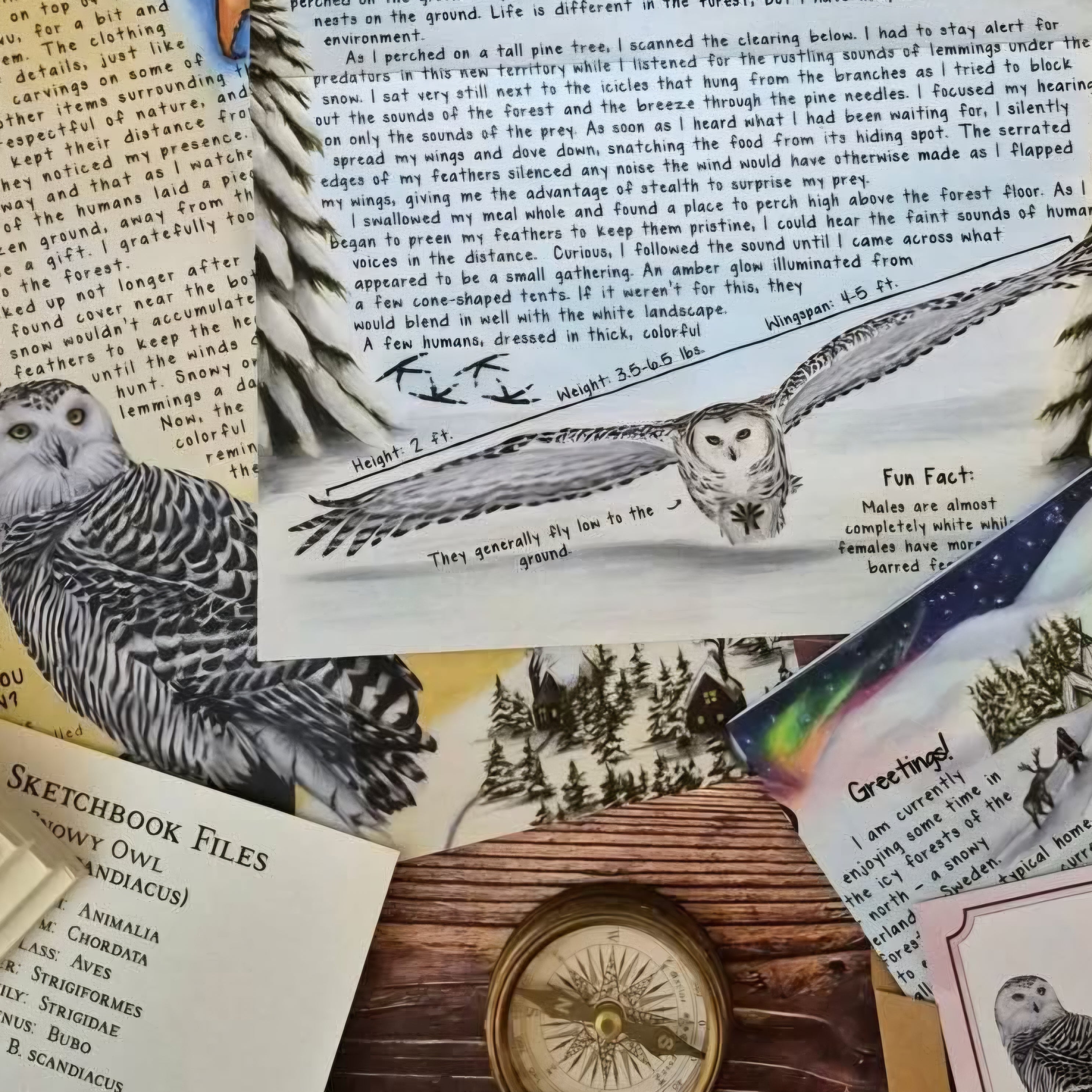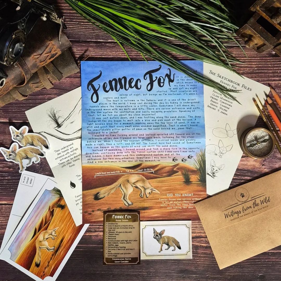 Each Writings from the Wild letter starts as a hand-drawn illustration, created with traditional paper and pencil. We then make high-quality prints from the originals, so every package stays affordable. The result is a blend of artistry and education, making it possible to share these stories far and wide while preserving the handcrafted heart behind them.